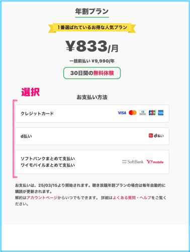 お支払いは〇〇/〇〇/〇〇(年月日)より開始されます。聴き放題年割プランの場合は自動的に購読できます。