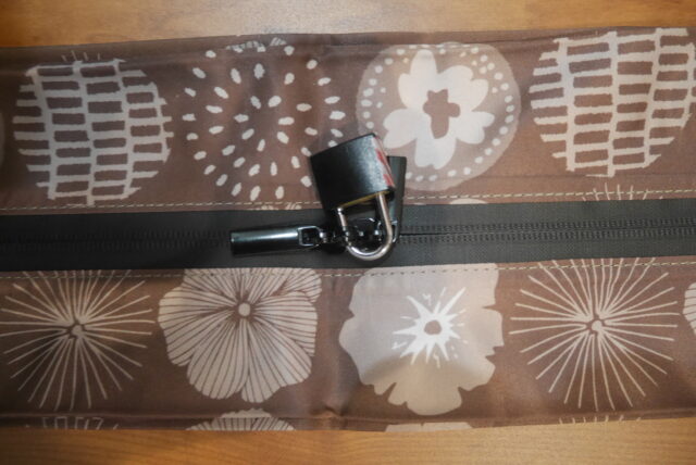 南京錠はミニサイズです。2つのファスナーが重なるところに穴があり、そこに南京錠を通せる仕様になっています。