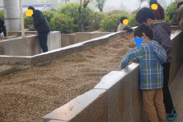 私は外から見学をしていたのですが、黒いエプロンをつけたスタッフの方が時折、山になった砂利を平らにならしていました。