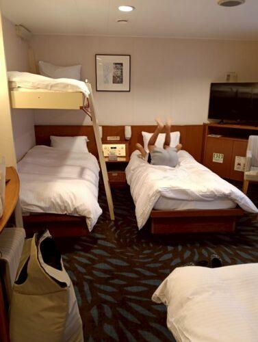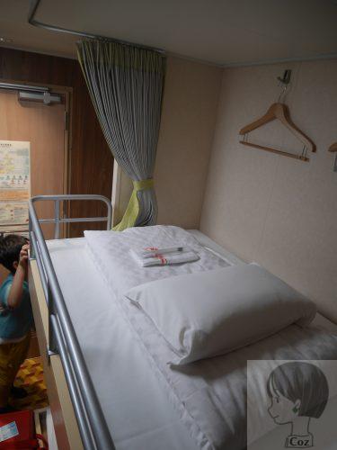 行きは、4名1室の個室でした。2段ベッドが2つと2段ベッドの間に靴を脱いでくつろげるスペース(小上がり)がありました。窓もあって船外の海が見られるところがよかったです!くれない、むらさきに比べて広々していました。