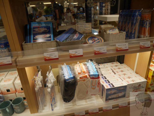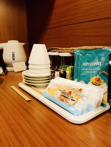 コーヒーやお茶のセットも充実。さんふらわぁのお土産店でも販売されている船の形のクッキーもありました。さんふらわぁオリジナルミネラルウォーターのペットボトルが人数分ありました。