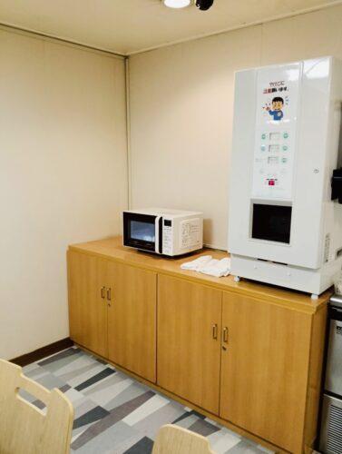 電子レンジ、無料の冷水・お茶サーバー、製氷機があります。テーブルと椅子があるので、持ち込んだお弁当などをここで食べることもできます。