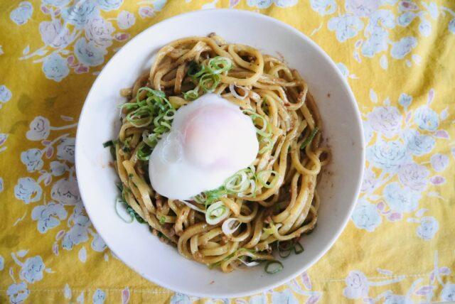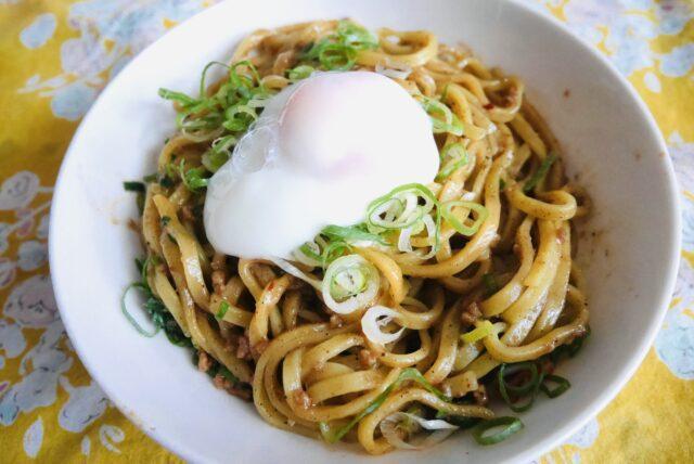 肉みそが入っているとはいえ、野菜やたんぱく質が不足するのでレンジで温泉卵をつくって、同じくイオンで買った刻みネギを載せて食べています。